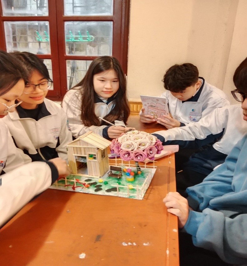 Ảnh: Sản phẩm của tổ 1 lớp 10C10 với vật liệu là tăm tre, bìa catong, giấy nhún.