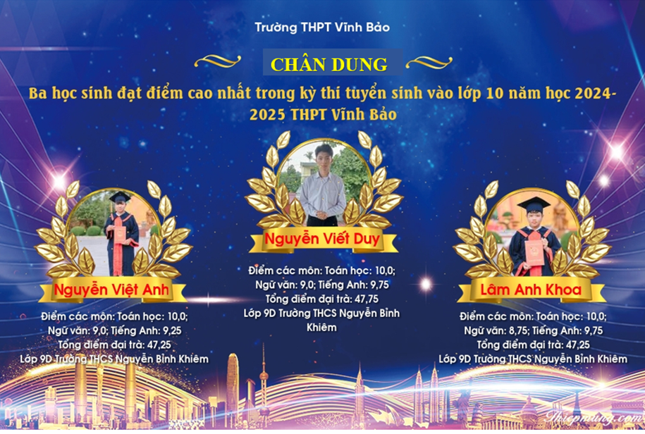 Đặc biệt chúc mừng các em Nguyễn Viết Duy, Lâm Anh Khoa, Nguyễn Việt Anh học sinh lớp 9D Trường THCS Nguyễn Bỉnh Khiêm đã xếp thứ 1,2,3 trong kỳ thi tuyển sinh vào lớp 10 trường THPT Vĩnh Bảo năm học 2024 – 2025!